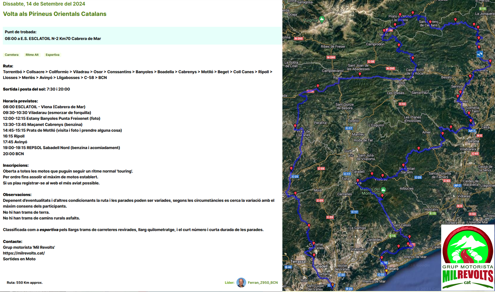 2 El Grup Motorista 'Mil Revolts' organitza sortides en grup per Catalunya. De moment portem més de 300 sortides des de l'2018. Habitualment, una sortida setmanal cada dimecres i els dissabtes cada quinzena. Des de la primavera a la tardor organitzem els viatges de dos o més dies, generalment cap als Països Catalans i als Pirineus.